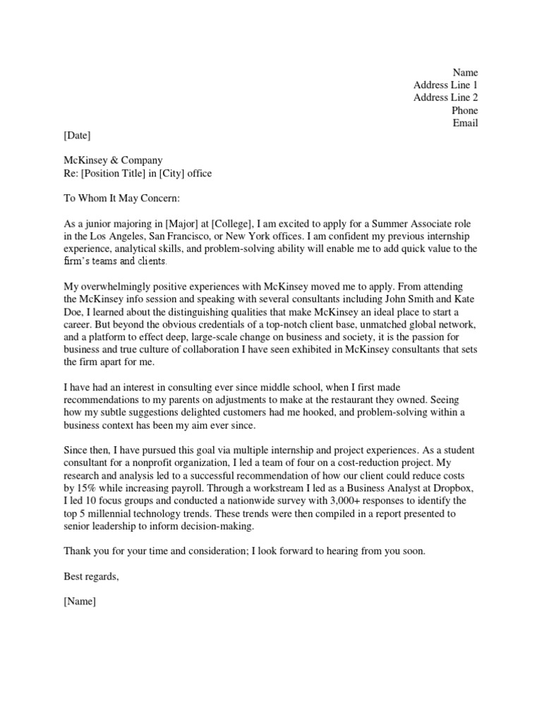 Top 10 internship cover letter tips internshipguide cover letter mckinsey. Cover letter • if you are applying for a position at mckinsey, you will be competing with a large number of graduates and working professionals who are also interested in breaking into the firm.